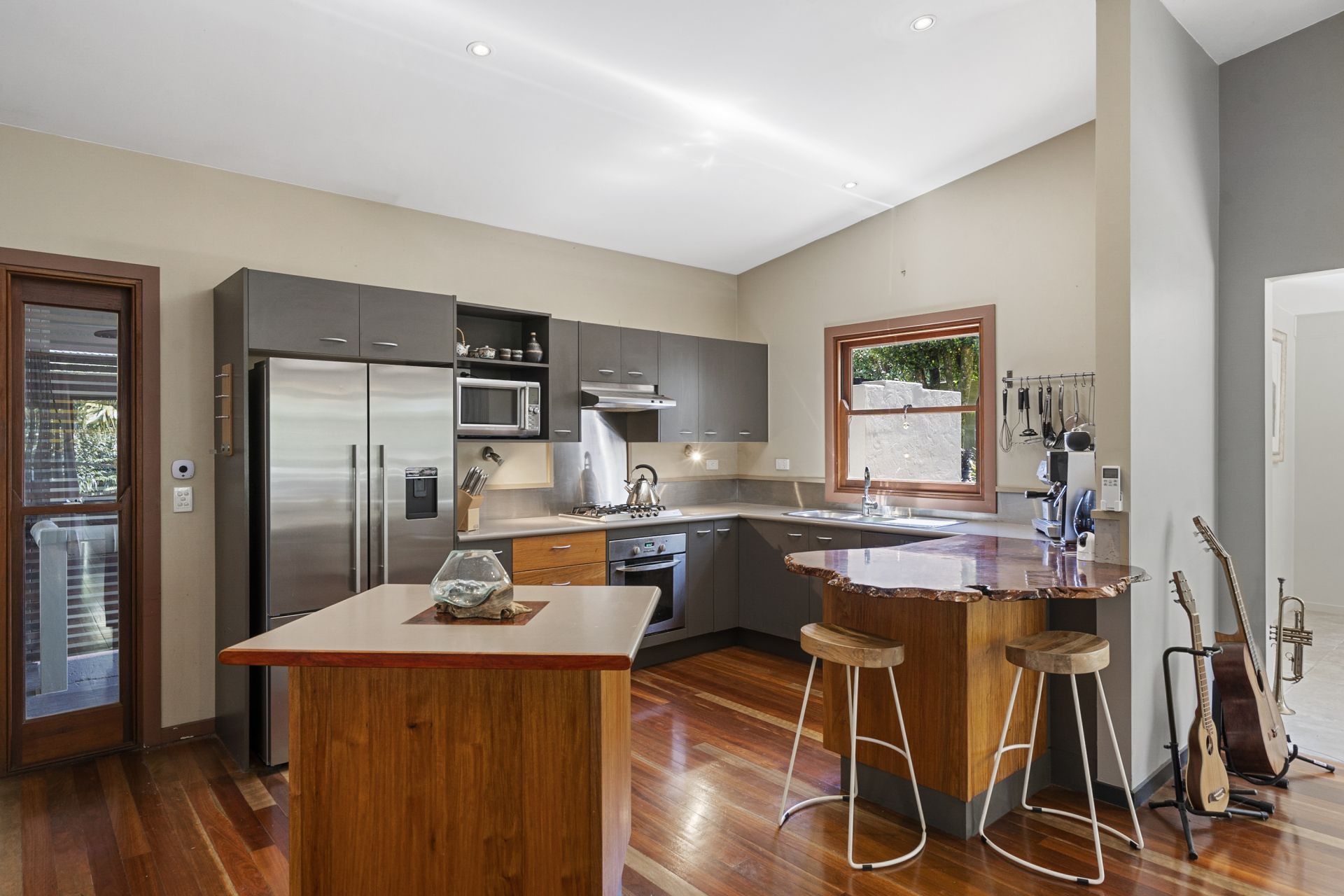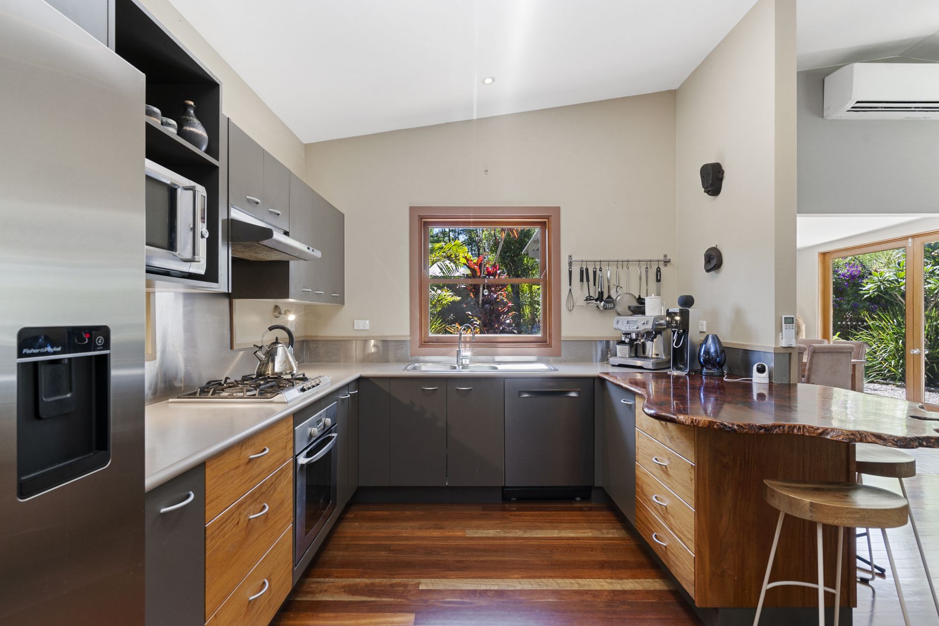 - Kitchen with an industrial style influence featuring gas cooktop, electric oven and stylish, brushed stainless steel, semi-integrated dishwasher. The unqiue and beautiful hand-crafted timber feature bench adds a feeling of natural warmth to the kitchen