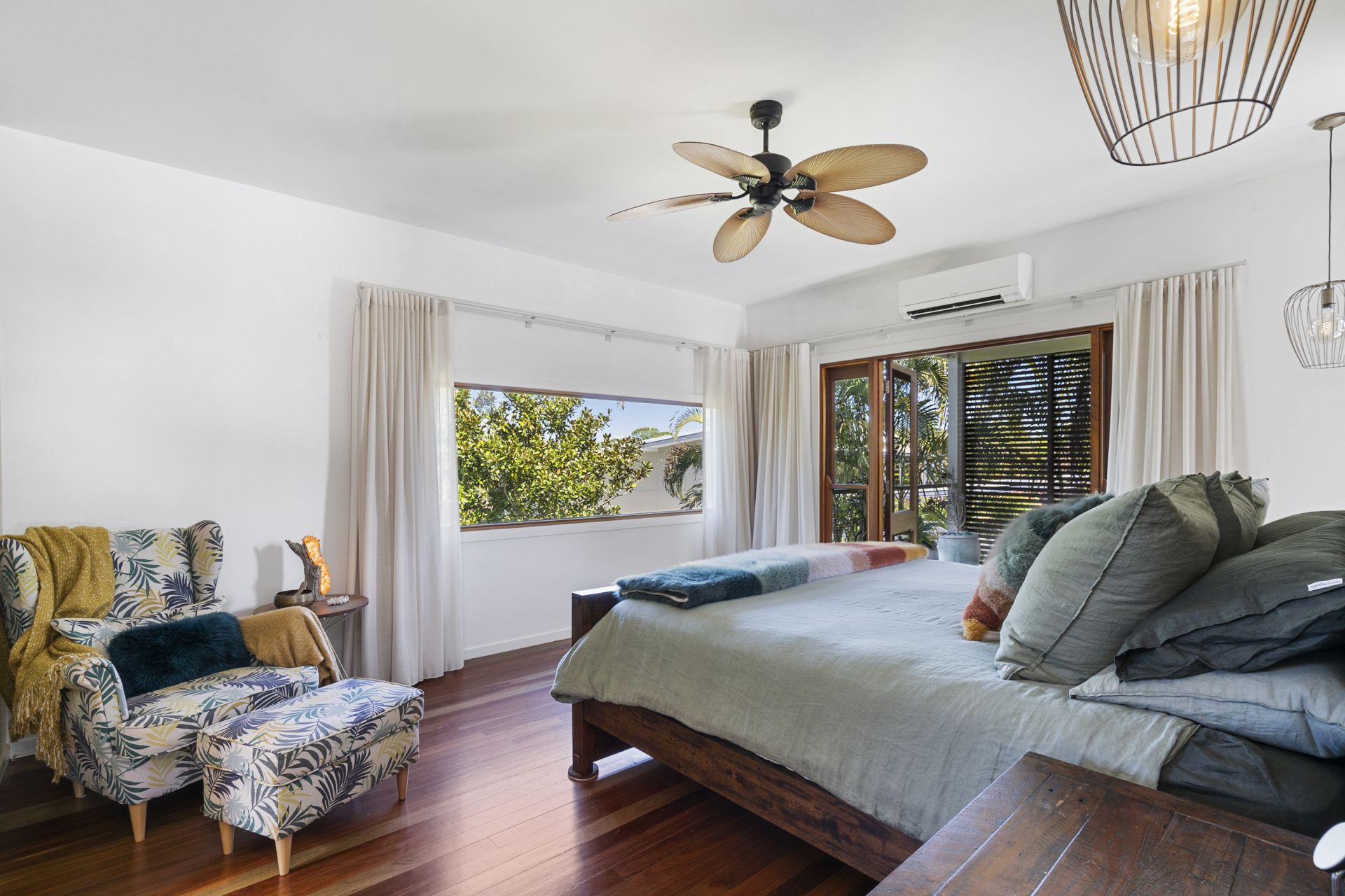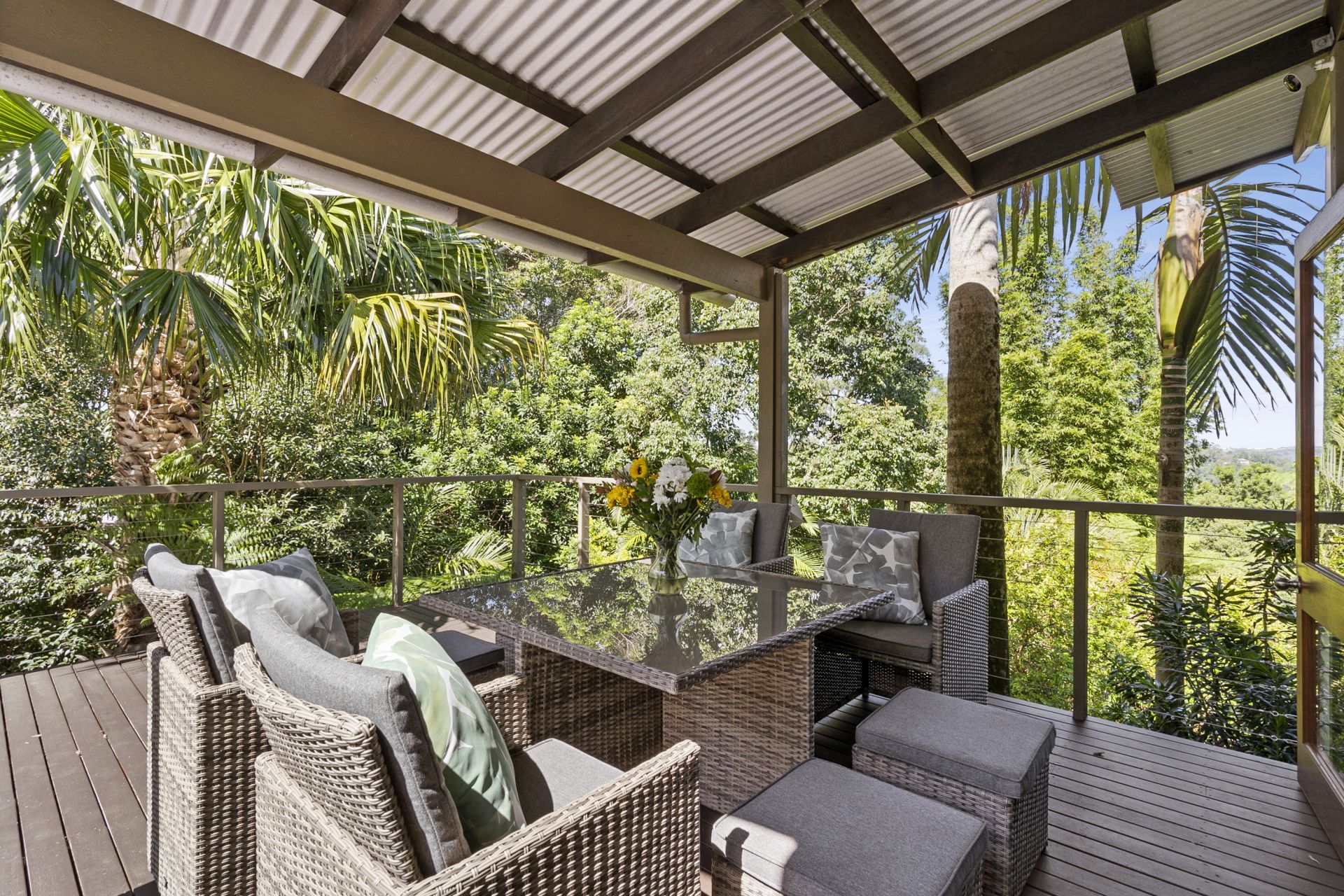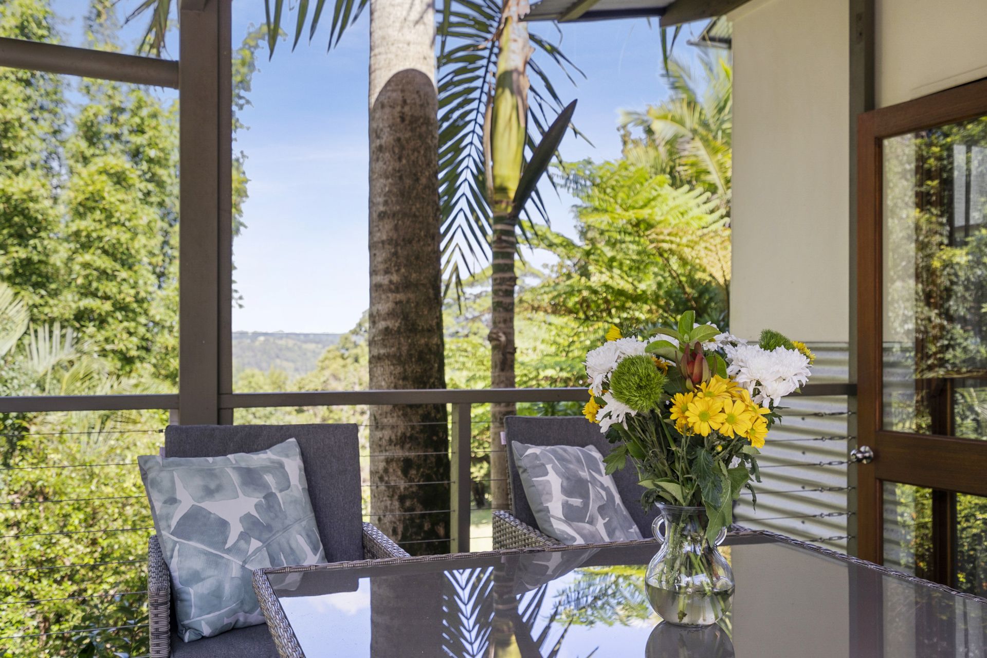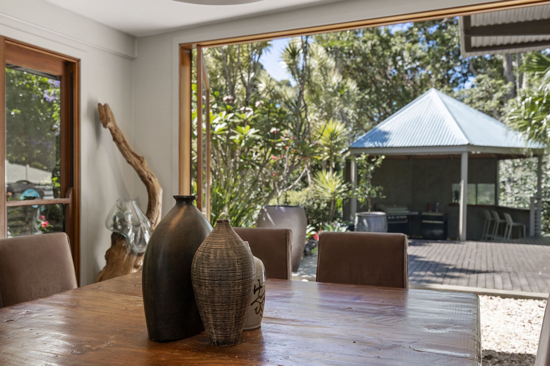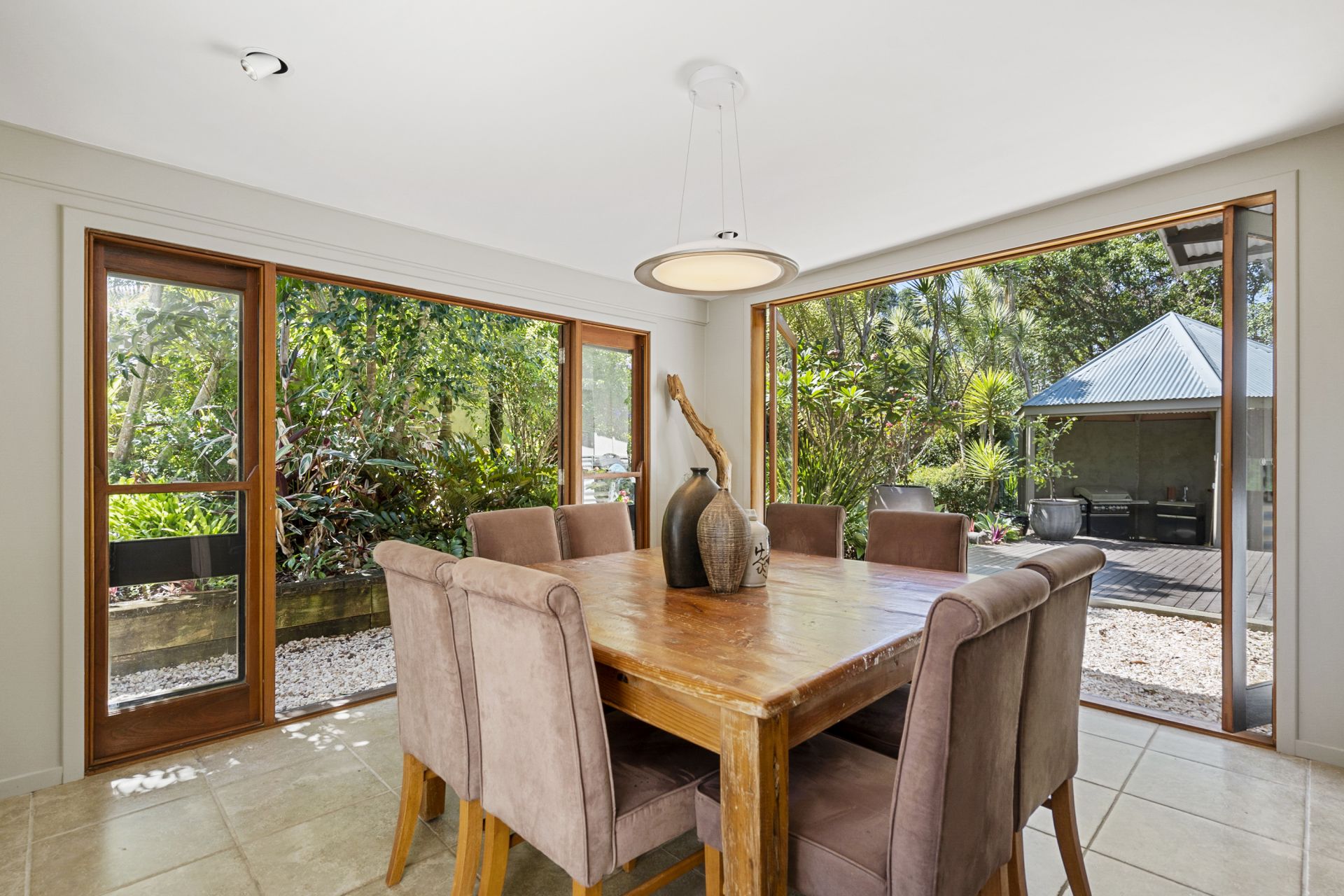 - Delicate sheer curtains frame the huge timber doors that lead to the light filled, fully glassed dining room overlooking the colourful terraced garden. This is a perfect spot to entertain family and friends all year round