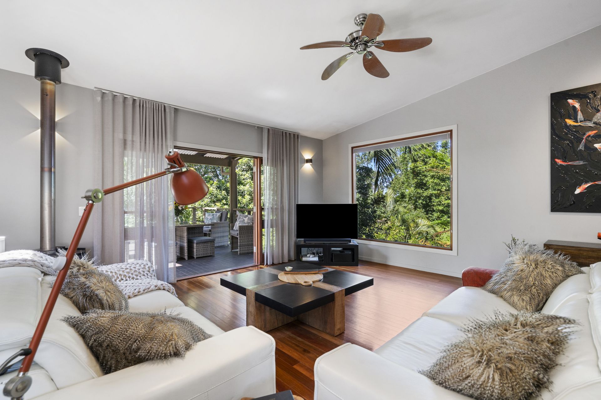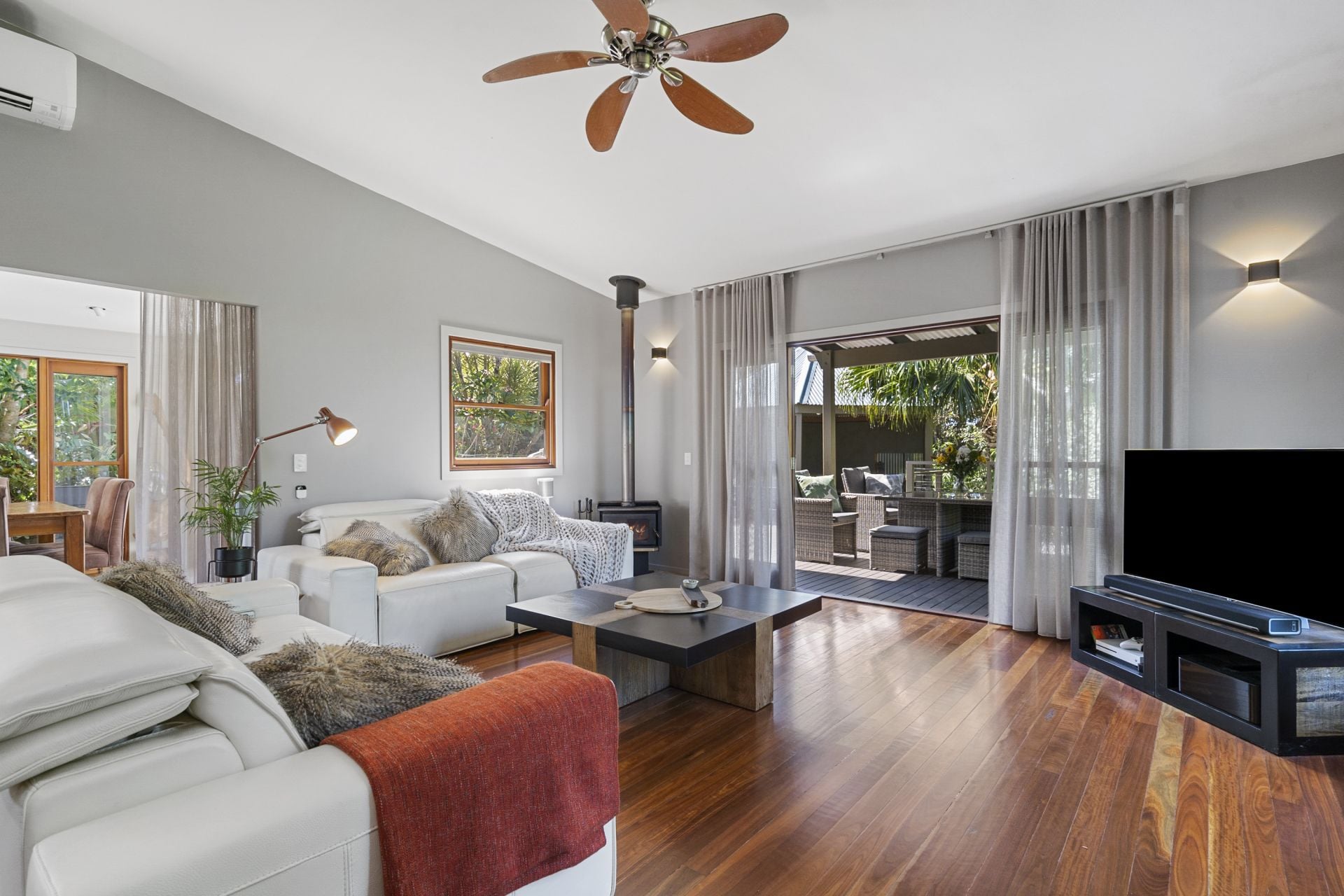 - Large open plan living area with stunning mixed Australian hardwood flooring, cosy fireplace and large windows and doors for extra light and air flow