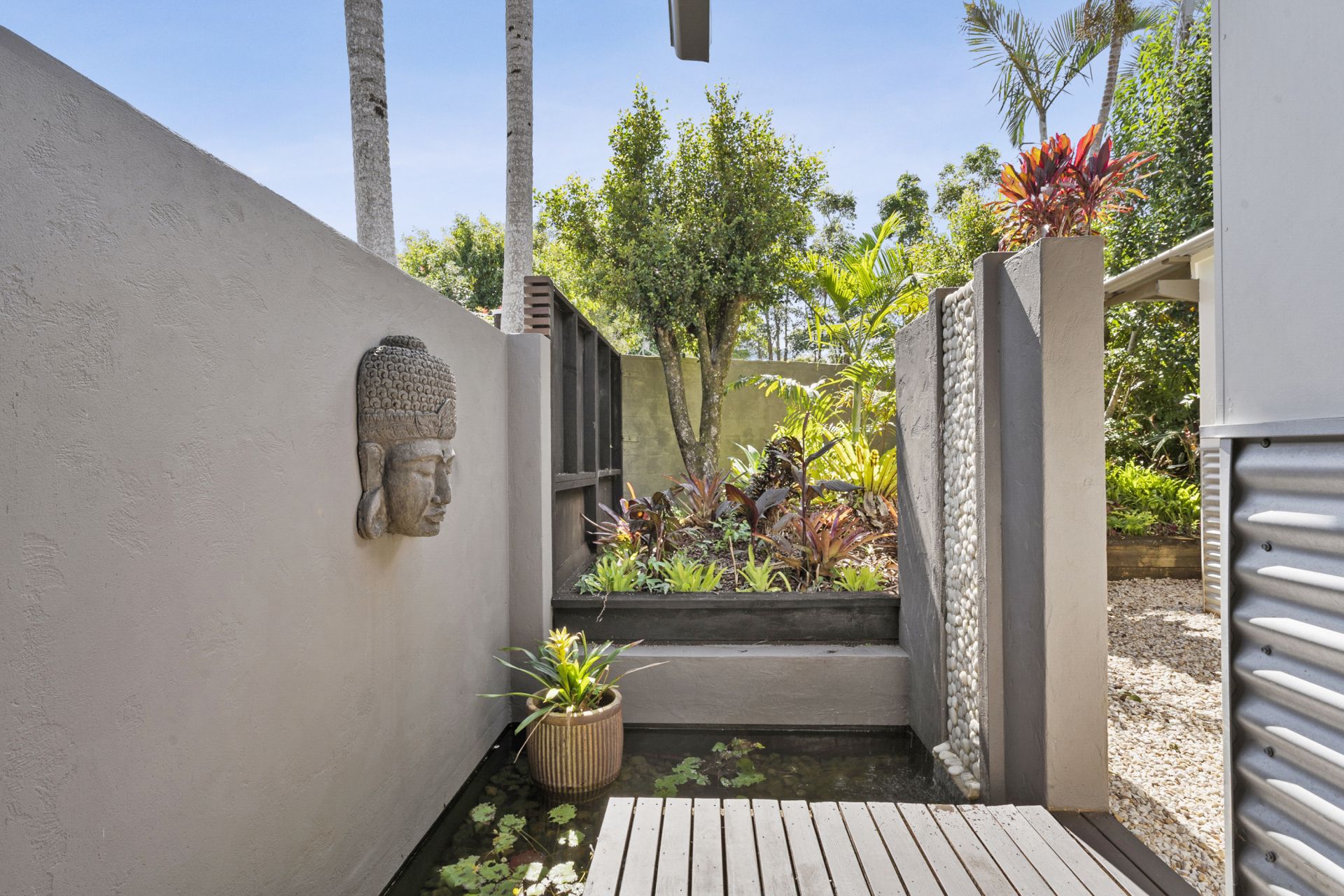 - Secure entry gate with large waterfall and feature fishponds which wrap around the timber walkway into the home